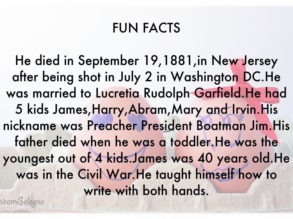 He died in September 19,1881,in New Jersey after being shot in July 2 in Washington DC.He was married to Lucretia Rudolph Garfield.He had 5 kids James,Harry,Abram,Mary and Irvin.His nickname was Preacher President Boatman Jim.His father died when he was a toddler.He was the youngest out of 4 kids.James was 40 years old.He was in the Civil War.He taught himself how to write with both hands.