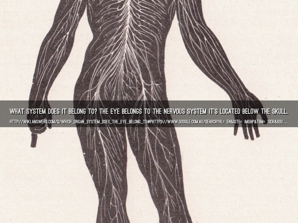 What system does it belong to? The eye belongs to the nervous system it's located below the skull.