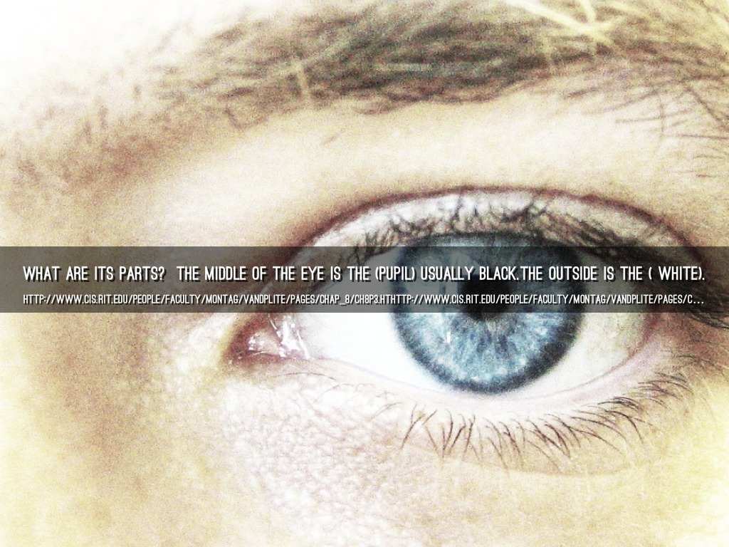 What are its parts? The middle of the eye is the (pupil) usually black.The outside is the ( white).