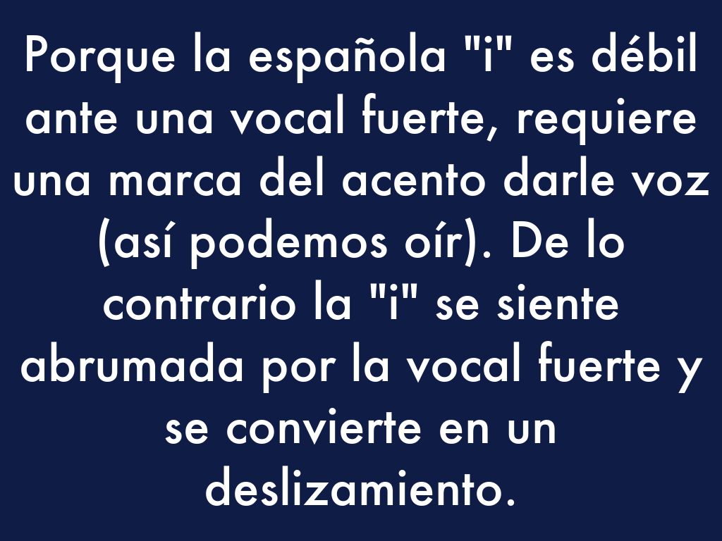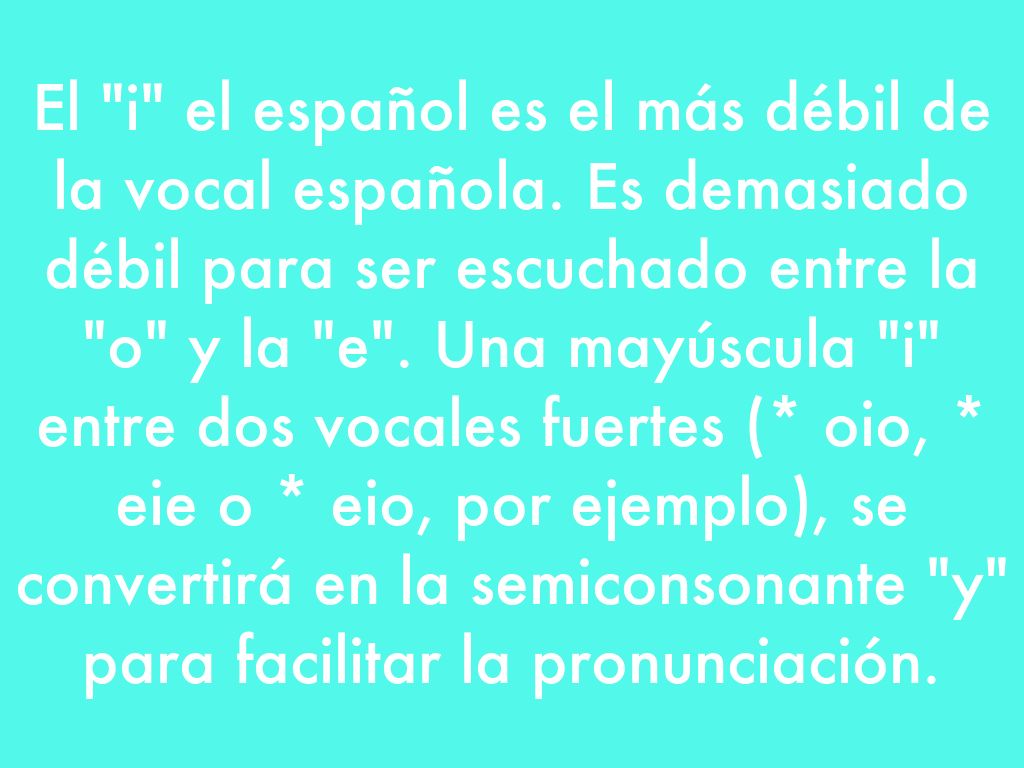 El "i" el español es el más débil de la vocal española. Es demasiado débil para ser escuchado entre la "o" y la "e". Una mayúscula "i" entre dos vocales fuertes (* oio, * eie o * eio, por ejemplo), se convertirá en la semiconsonante "y" para facilitar la pronunciación.