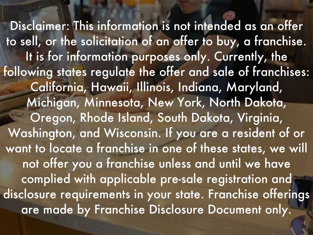 Disclaimer: This information is not intended as an offer to sell, or the solicitation of an offer to buy, a franchise. It is for information purposes only. Currently, the following states regulate the offer and sale of franchises: California, Hawaii, Illinois, Indiana, Maryland, Michigan, Minnesota, New York, North Dakota, Oregon, Rhode Island, South Dakota, Virginia, Washington, and Wisconsin. If you are a resident of or want to locate a franchise in one of these states, we will not offer you a franchise unless and until we have complied with applicable pre-sale registration and disclosure requirements in your state. Franchise offerings are made by Franchise Disclosure Document only.