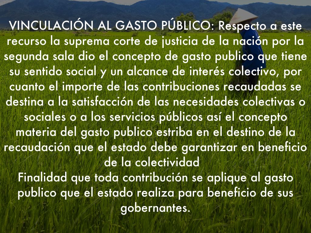 VINCULACIÓN AL GASTO PÚBLICO: Respecto a este recurso la suprema corte de justicia de la nación por la segunda sala dio el concepto de gasto publico que tiene su sentido social y un alcance de interés colectivo, por cuanto el importe de las contribuciones recaudadas se destina a la satisfacción de las necesidades colectivas o sociales o a los servicios públicos así el concepto materia del gasto publico estriba en el destino de la recaudación que el estado debe garantizar en beneficio de la colectividad