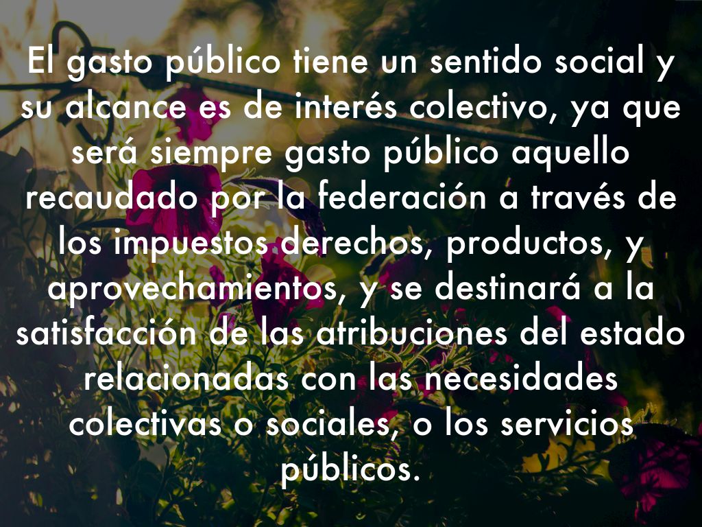 El gasto público tiene un sentido social y su alcance es de interés colectivo, ya que será siempre gasto público aquello recaudado por la federación a través de los impuestos derechos, productos, y aprovechamientos, y se destinará a la satisfacción de las atribuciones del estado relacionadas con las necesidades colectivas o sociales, o los servicios públicos.