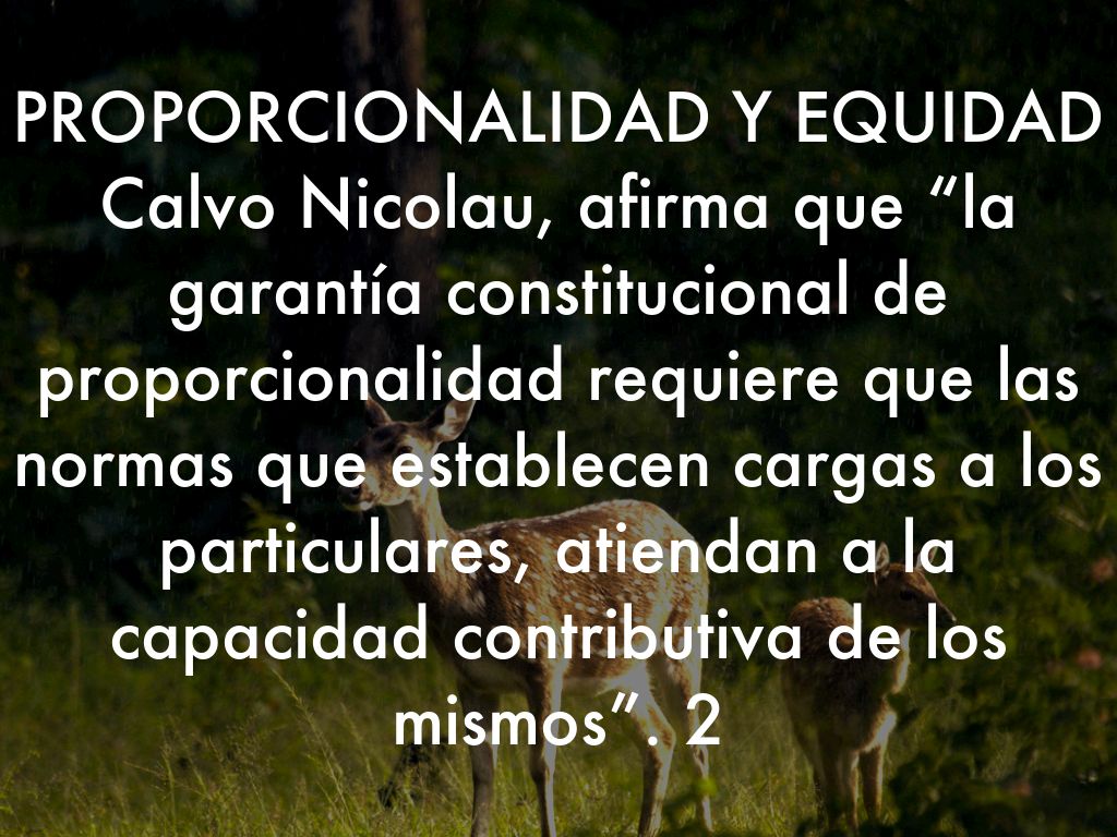 PROPORCIONALIDAD Y EQUIDAD Calvo Nicolau, afirma que “la garantía constitucional de proporcionalidad requiere que las normas que establecen cargas a los particulares, atiendan a la capacidad contributiva de los mismos”. 2