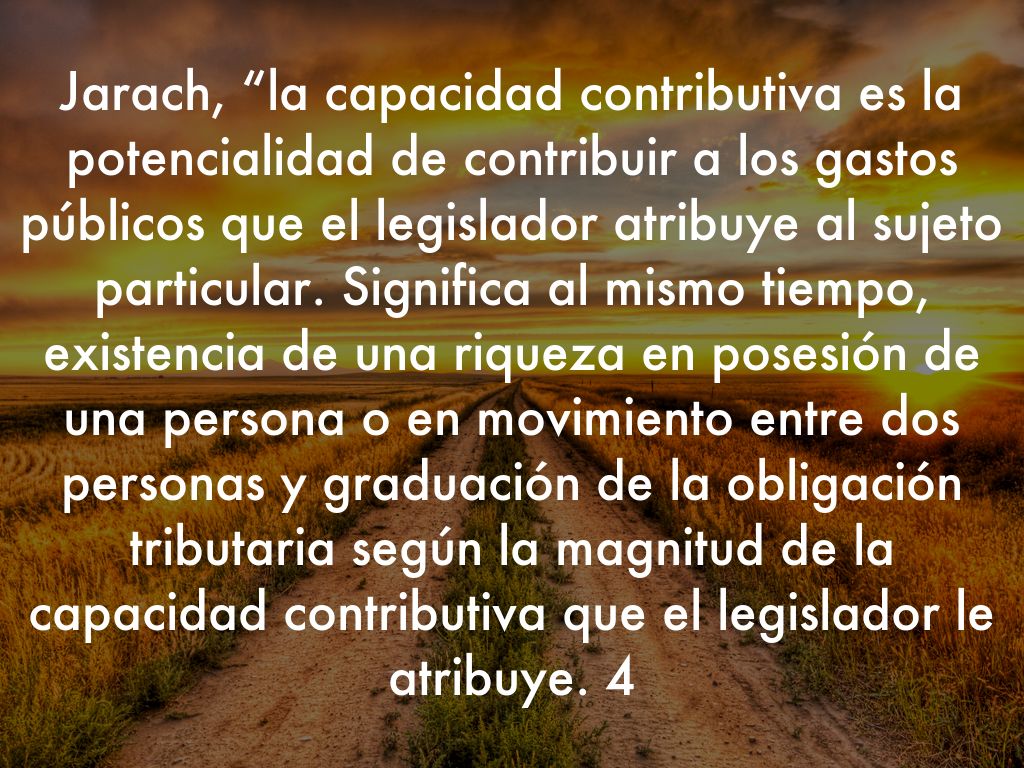 Jarach, “la capacidad contributiva es la potencialidad de contribuir a los gastos públicos que el legislador atribuye al sujeto particular. Significa al mismo tiempo, existencia de una riqueza en posesión de una persona o en movimiento entre dos personas y graduación de la obligación tributaria según la magnitud de la capacidad contributiva que el legislador le atribuye. 4