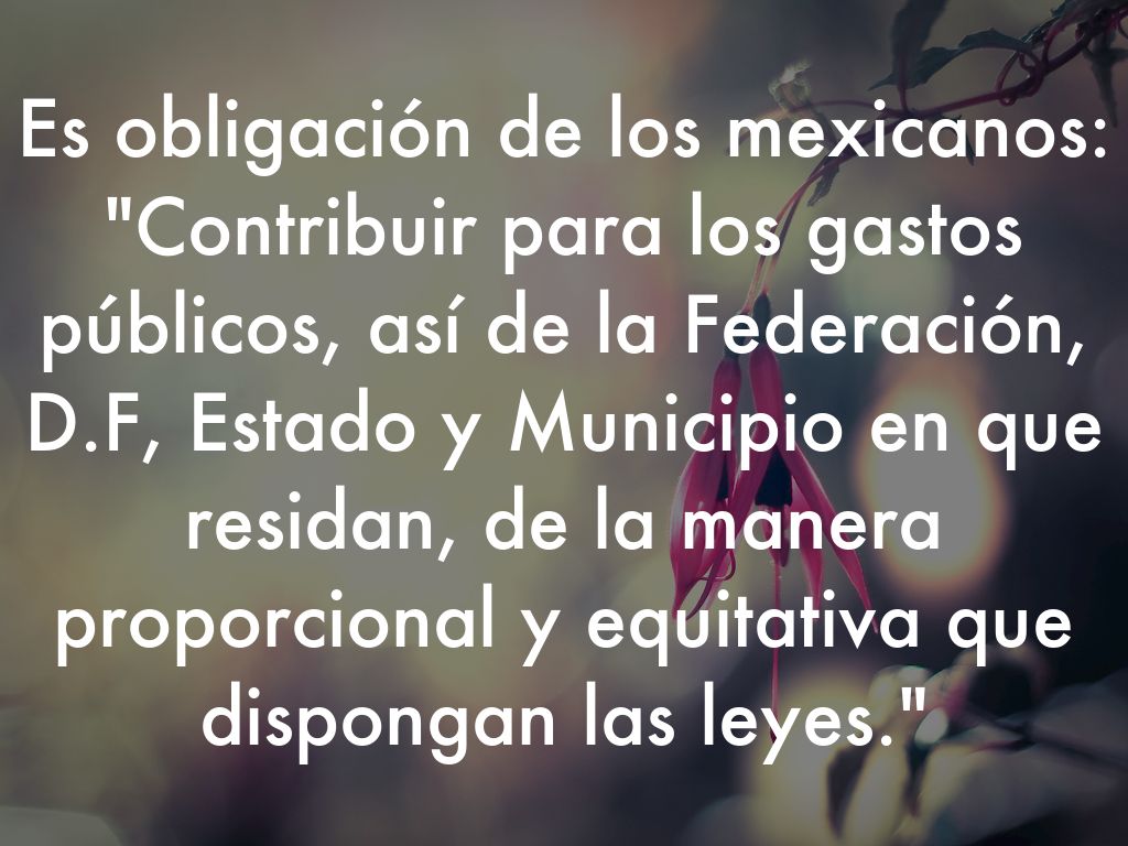 Es obligación de los mexicanos: "Contribuir para los gastos públicos, así de la Federación, D.F, Estado y Municipio en que residan, de la manera proporcional y equitativa que dispongan las leyes."