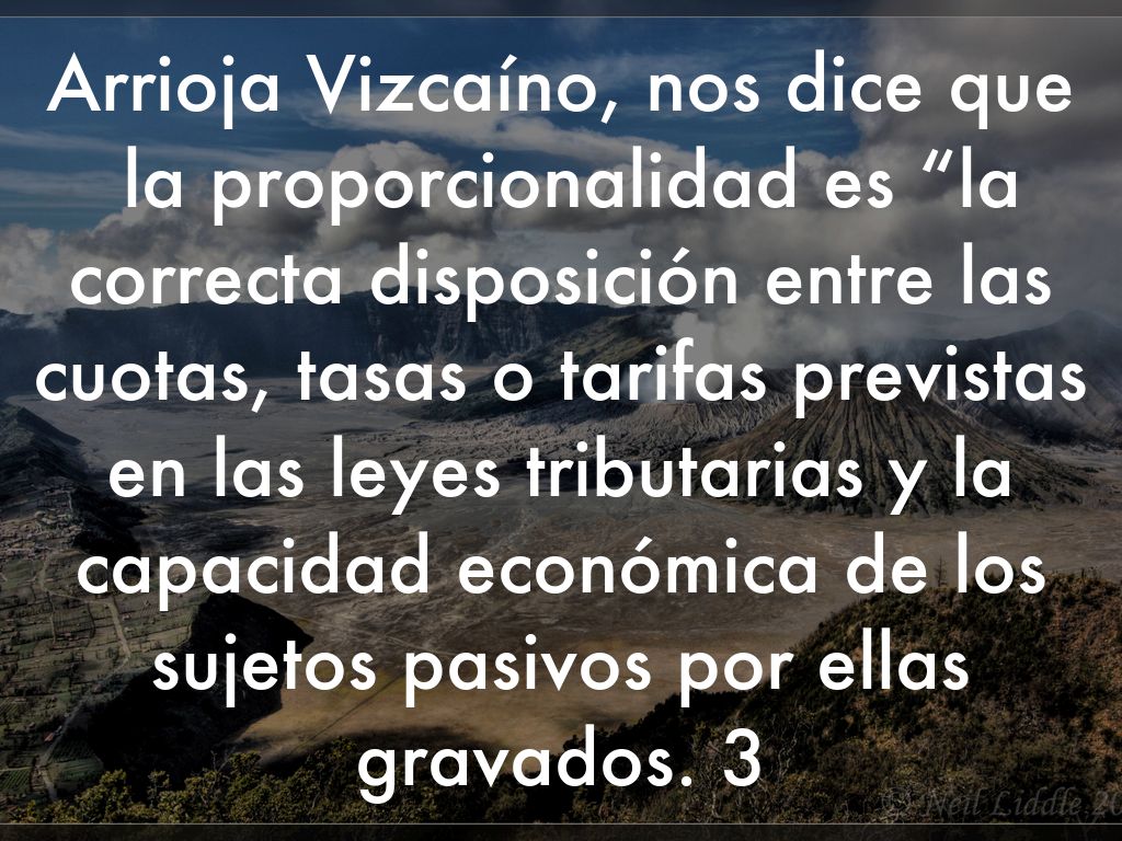 Arrioja Vizcaíno, nos dice que la proporcionalidad es “la correcta disposición entre las cuotas, tasas o tarifas previstas en las leyes tributarias y la capacidad económica de los sujetos pasivos por ellas gravados. 3
