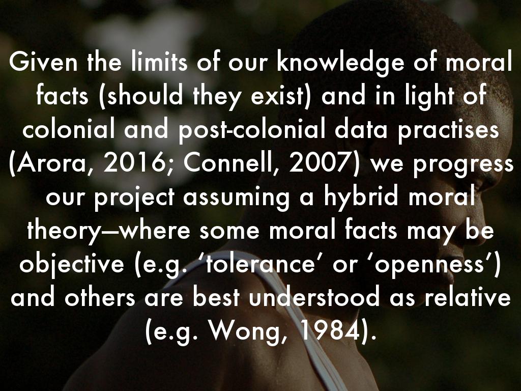 Given the limits of our knowledge of moral facts (should they exist) and in light of colonial and post-colonial data practises (Arora, 2016; Connell, 2007) we progress our project assuming a hybrid moral theory—where some moral facts may be objective (e.g. ‘tolerance’ or ‘openness’) and others are best understood as relative (e.g. Wong, 1984).