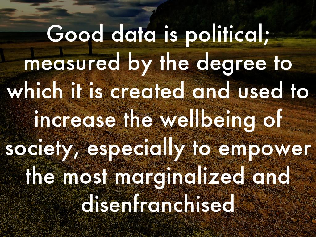 Good data is political; measured by the degree to which it is created and used to increase the wellbeing of society, especially to empower the most marginalized and disenfranchised