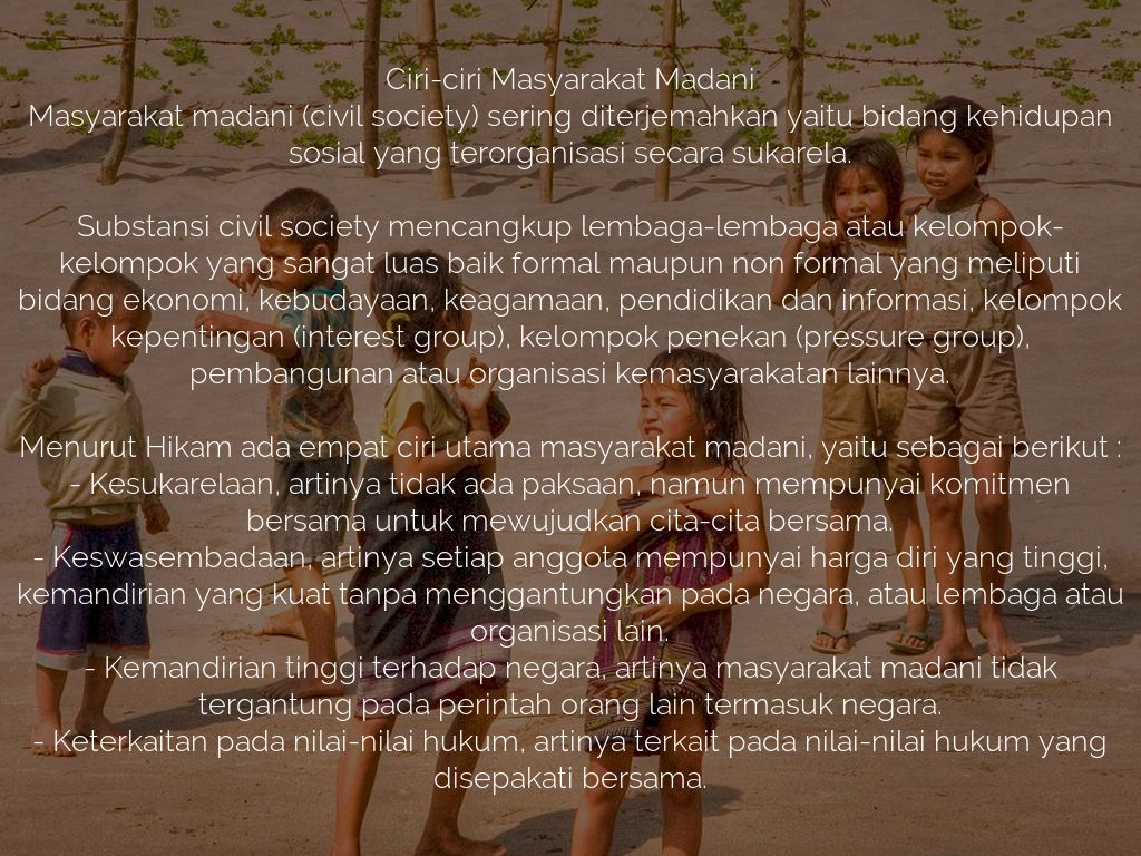 Menurut Hikam ada empat ciri utama masyarakat madani, yaitu sebagai berikut : - Kesukarelaan, artinya tidak ada paksaan, namun mempunyai komitmen bersama untuk mewujudkan cita-cita bersama. - Keswasembadaan, artinya setiap anggota mempunyai harga diri yang tinggi, kemandirian yang kuat tanpa menggantungkan pada negara, atau lembaga atau organisasi lain. - Kemandirian tinggi terhadap negara, artinya masyarakat madani tidak tergantung pada perintah orang lain termasuk negara. - Keterkaitan pada nilai-nilai hukum, artinya terkait pada nilai-nilai hukum yang disepakati bersama.