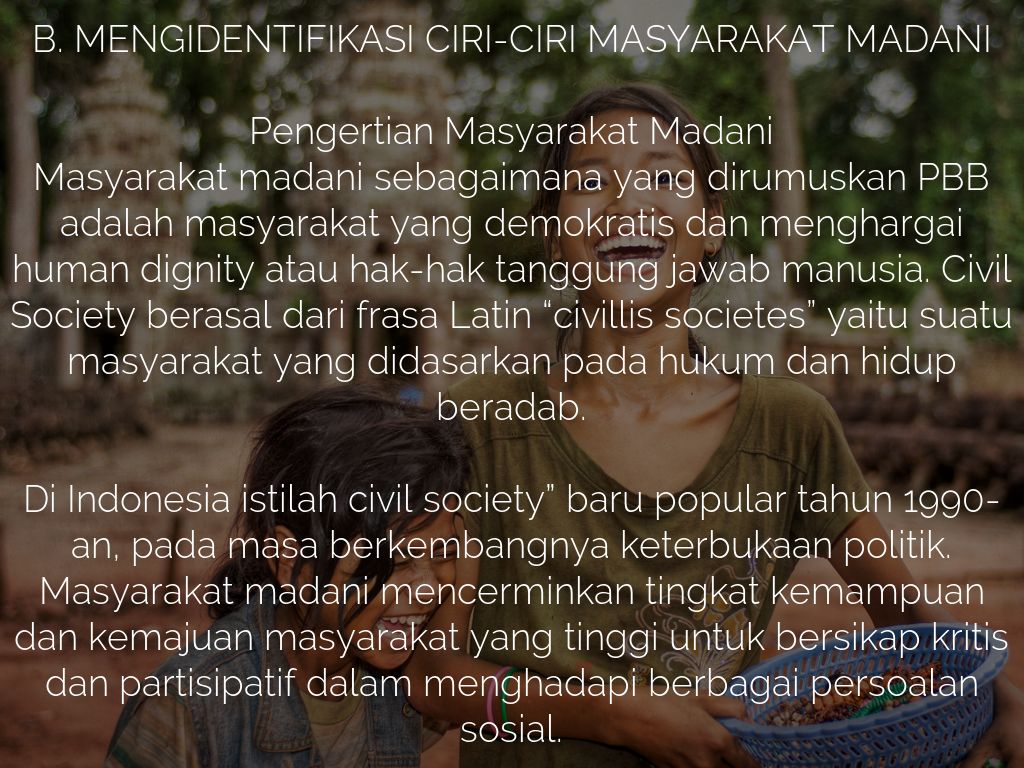 Pengertian Masyarakat Madani Masyarakat madani sebagaimana yang dirumuskan PBB adalah masyarakat yang demokratis dan menghargai human dignity atau hak-hak tanggung jawab manusia. Civil Society berasal dari frasa Latin “civillis societes” yaitu suatu masyarakat yang didasarkan pada hukum dan hidup beradab.