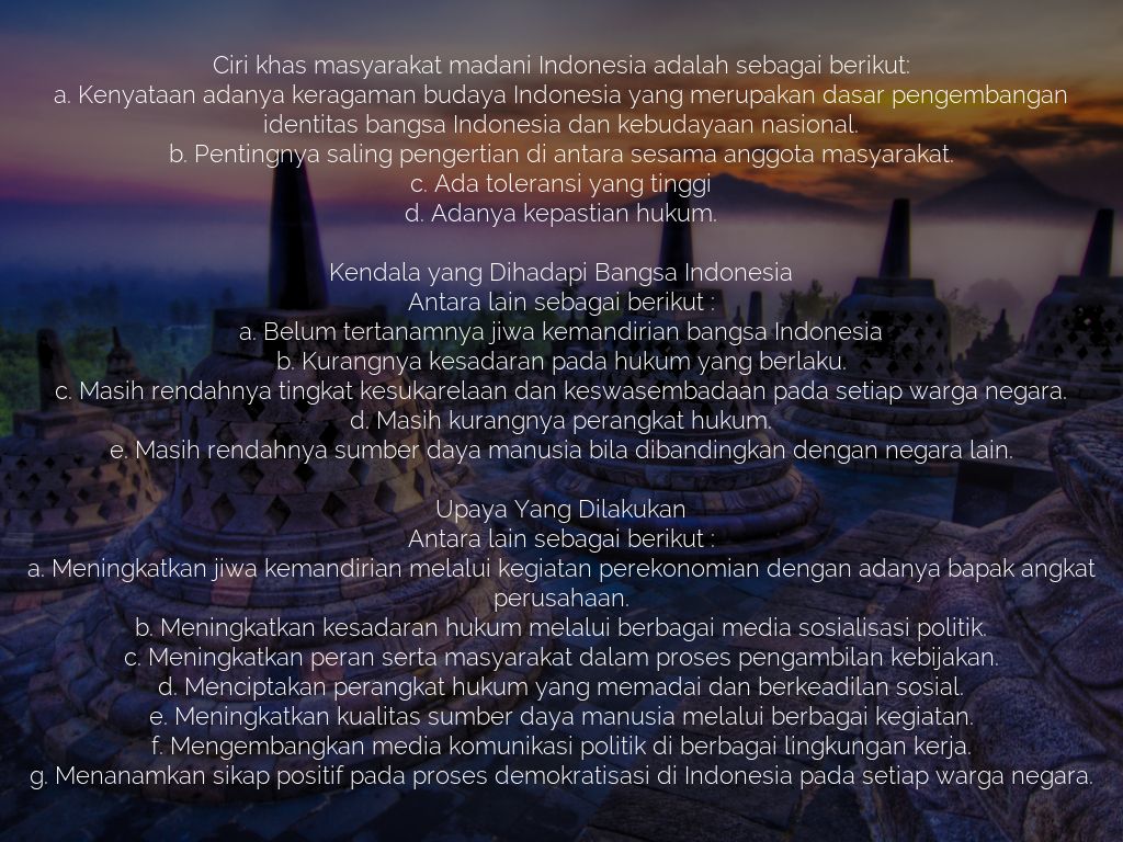 Ciri khas masyarakat madani Indonesia adalah sebagai berikut: a. Kenyataan adanya keragaman budaya Indonesia yang merupakan dasar pengembangan identitas bangsa Indonesia dan kebudayaan nasional. b. Pentingnya saling pengertian di antara sesama anggota masyarakat. c. Ada toleransi yang tinggi d. Adanya kepastian hukum.