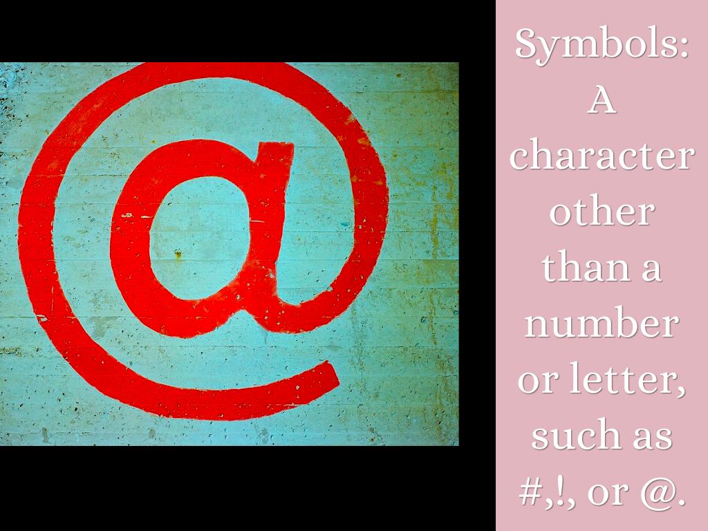 Symbols: A character other than a number or letter, such as #,!, or @.