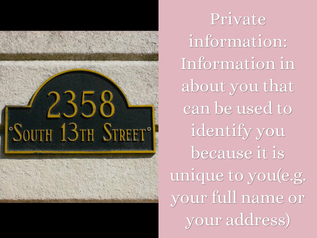 Private information: Information in about you that can be used to identify you because it is unique to you(e.g. your full name or your address)
