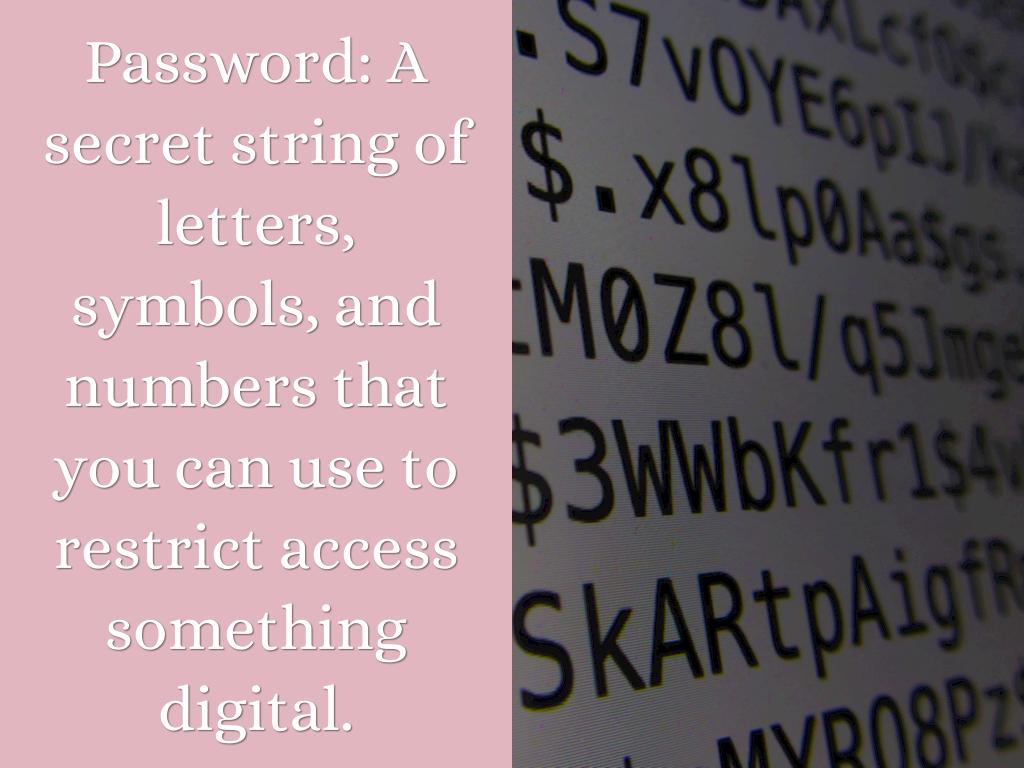 Password: A secret string of letters, symbols, and numbers that you can use to restrict access something digital.