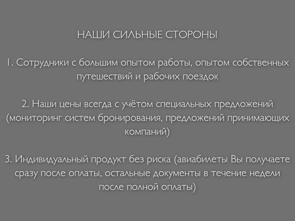 * мы имеем прямые контракты с ведущими отелями мира, принимающими компаниями и авиаперевозчиками;