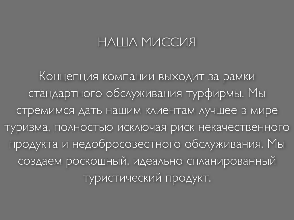 Концепция компании выходит за рамки стандартного обслуживания турфирмы. Мы стремимся дать нашим клиентам лучшее в мире туризма, полностью исключая риск некачественного продукта и недобросовестного обслуживания. Мы создаем роскошный, идеально спланированный туристический продукт.