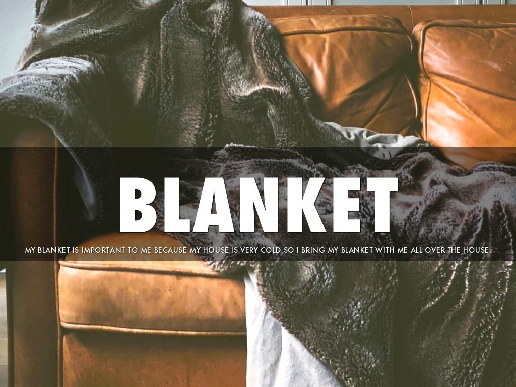 MY BLANKET IS IMPORTANT TO ME BECAUSE MY HOUSE IS VERY COLD SO I BRING MY BLANKET WITH ME ALL OVER THE HOUSE.