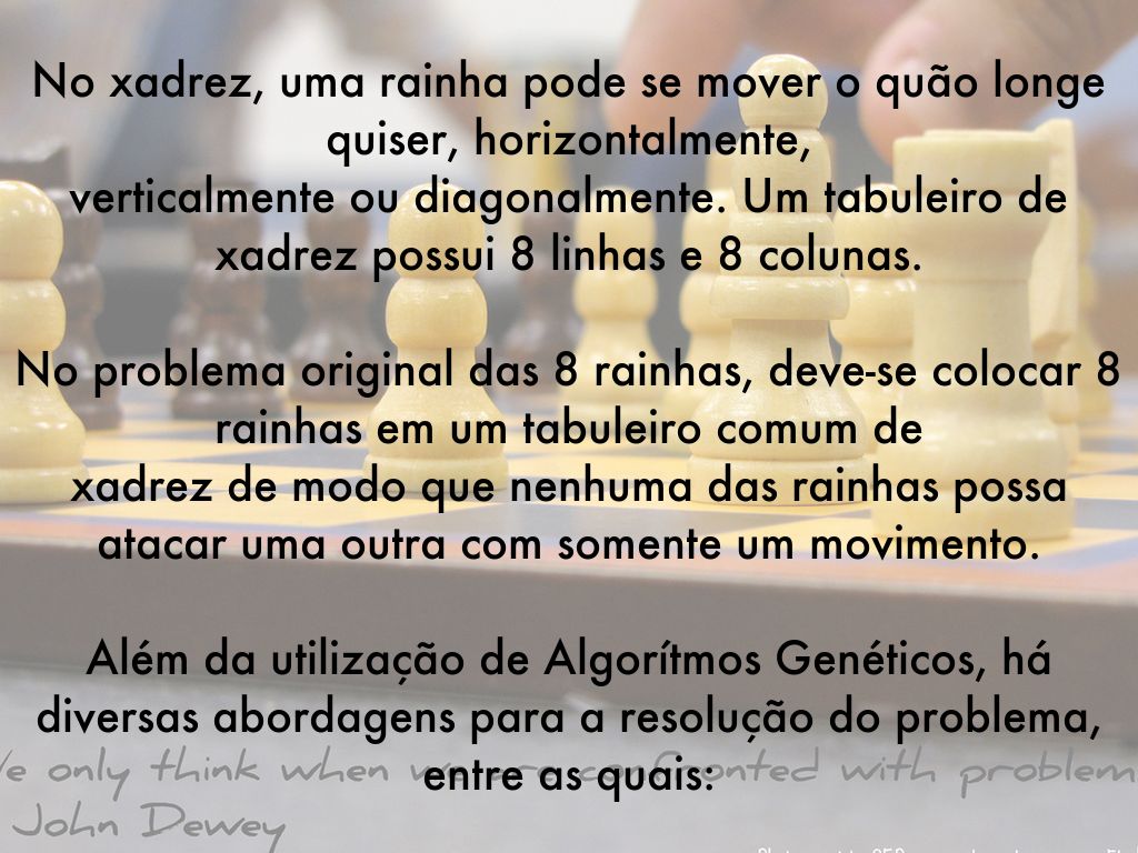 No problema original das 8 rainhas, deve-se colocar 8 rainhas em um tabuleiro comum de