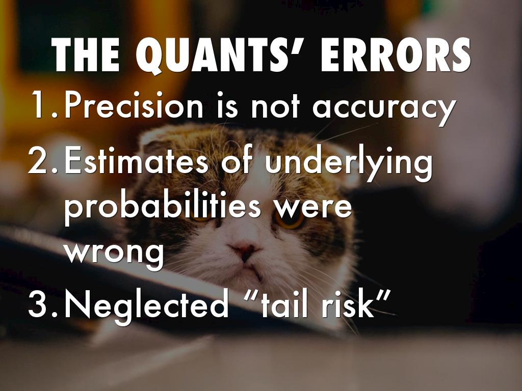 PRESENTATION OUTLINEPROBLEMS WITH PROBABILITY “Quants” assigned a dollar figure representing how much the firm could lose each day with 99% probability PROBABILITIES BASED ON PREVIOUS PERFORMANCE There is no known probability distribution of a systemic crisis or wide-spread emergency. Almost by definition, these things are too rare. THE QUANTS’ ERRORS Precision is not accuracy Estimates of underlying probabilities were wrong Neglected “tail risk” Remember the metaphor of statistics as a gun? Can be incredibly useful in the right hands, but very dangerous in the wrong ones. THE MOST COMMON PROB PROBS ASSUMING EVENTS ARE INDEPENDENT SIDS OR “COT DEATH” IN UK, 1990S THE SPORTS ILLUSTRATED JINX This does not contradict the gambler’s fallacy. BUSINESSWEEK’S “BEST MANAGERS” STATISTICAL DISCRIMINATION EUROPEAN COMMISSION POLICY: GENDER PREDICTIVE ANALYTICS = PROFILING “STATISTICAL DISCRIMINATION” How we use statistics have social implications. What we can and should do with this information is an ethical and legal question. We aren’t always ready for that. JUST BECAUSE YOUR CALCULATION IS RIGHT, Haiku Deck Pro User