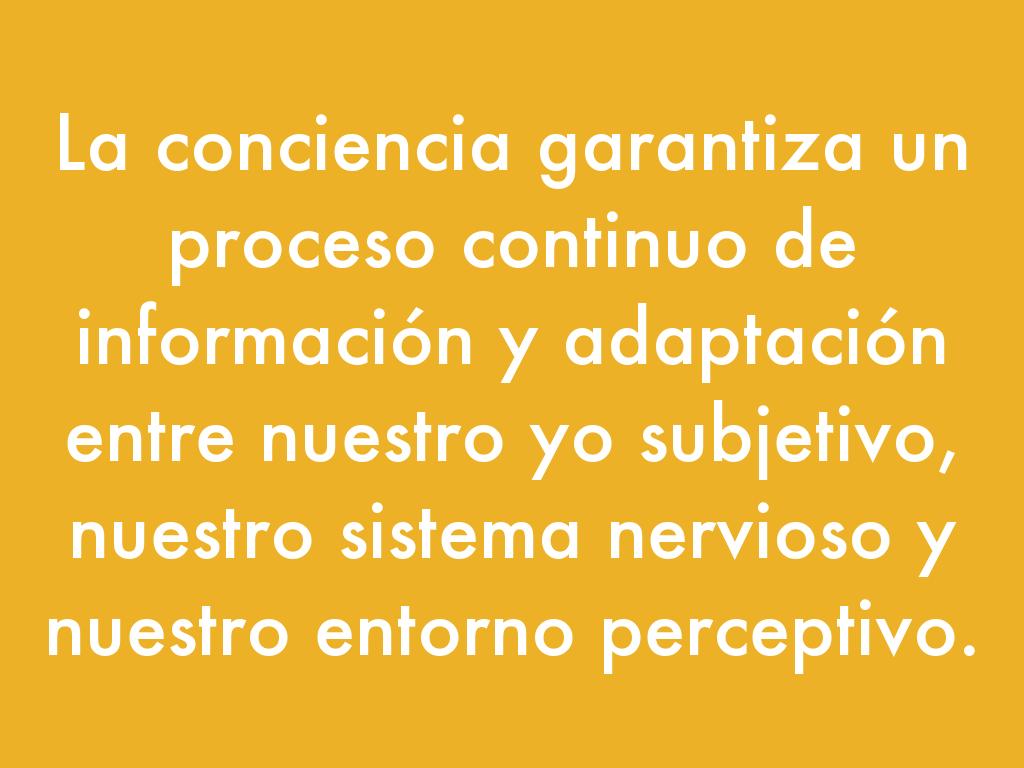 La conciencia garantiza un proceso continuo de información y adaptación entre nuestro yo subjetivo, nuestro sistema nervioso y nuestro entorno perceptivo.