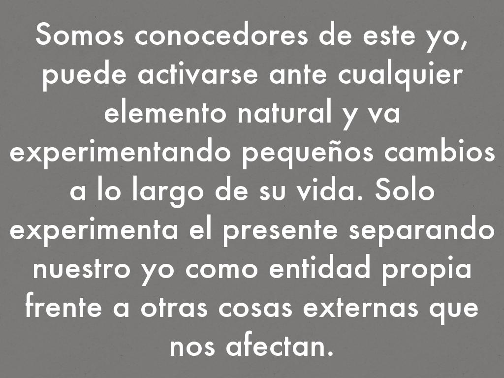 Somos conocedores de este yo, puede activarse ante cualquier elemento natural y va experimentando pequeños cambios a lo largo de su vida. Solo experimenta el presente separando nuestro yo como entidad propia frente a otras cosas externas que nos afectan.