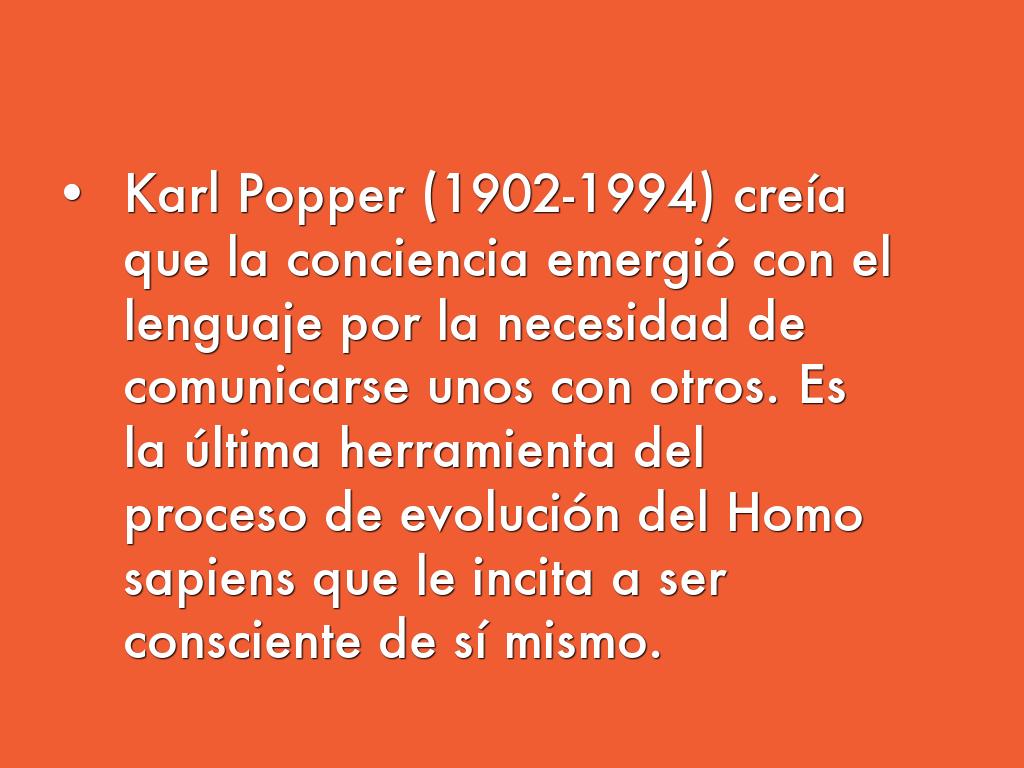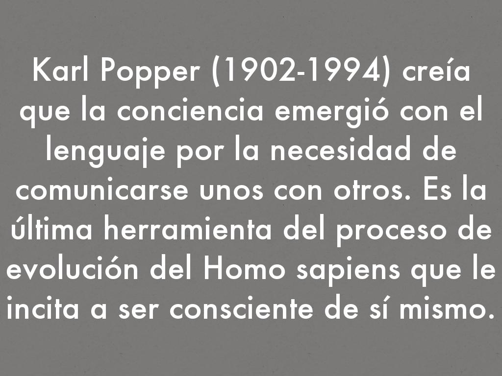 - Karl Popper (1902-1994) creía que la conciencia emergió con el lenguaje por la necesidad de comunicarse unos con otros. Es la última herramienta del proceso de evolución del Homo sapiens que le incita a ser consciente de sí mismo.