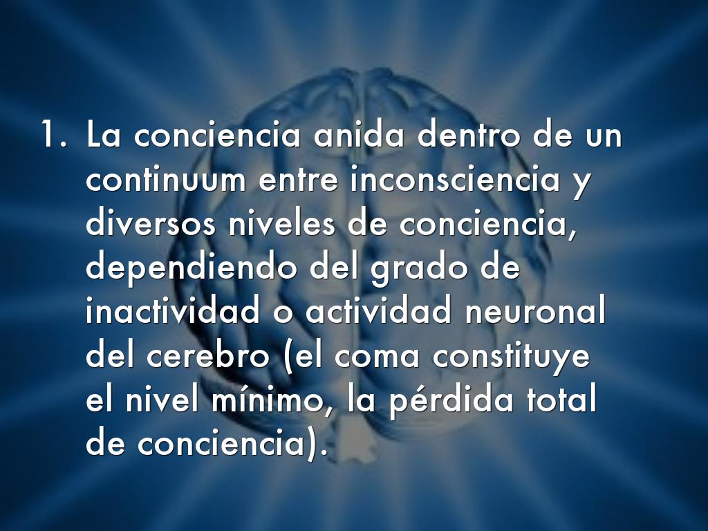 - La conciencia anida dentro de un continuum entre inconsciencia y diversos niveles de conciencia, dependiendo del grado de inactividad o actividad neuronal del cerebro (el coma constituye el nivel mínimo, la pérdida total de conciencia).