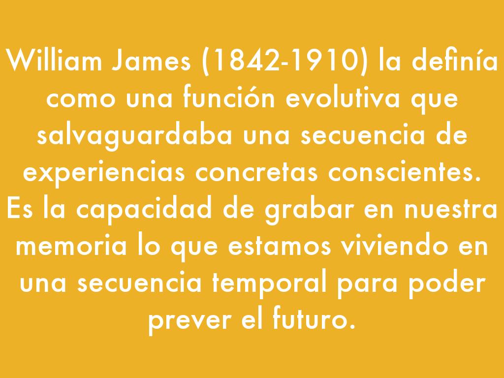 William James (1842-1910) la definía como una función evolutiva que salvaguardaba una secuencia de experiencias concretas conscientes. Es la capacidad de grabar en nuestra memoria lo que estamos viviendo en una secuencia temporal para poder prever el futuro.
