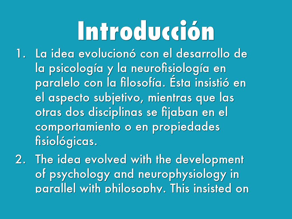 - La idea evolucionó con el desarrollo de la psicología y la neurofisiología en paralelo con la filosofía. Ésta insistió en el aspecto subjetivo, mientras que las otras dos disciplinas se fijaban en el comportamiento o en propiedades fisiológicas.