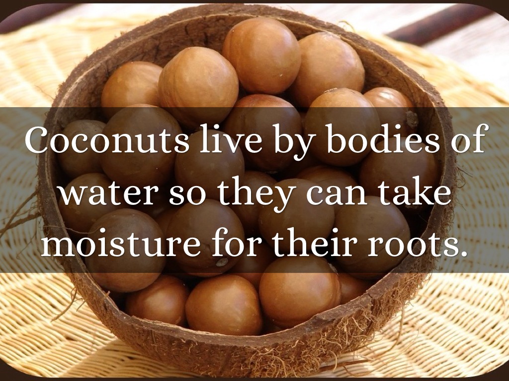 Coconuts live by bodies of water so they can take moisture for their roots.
