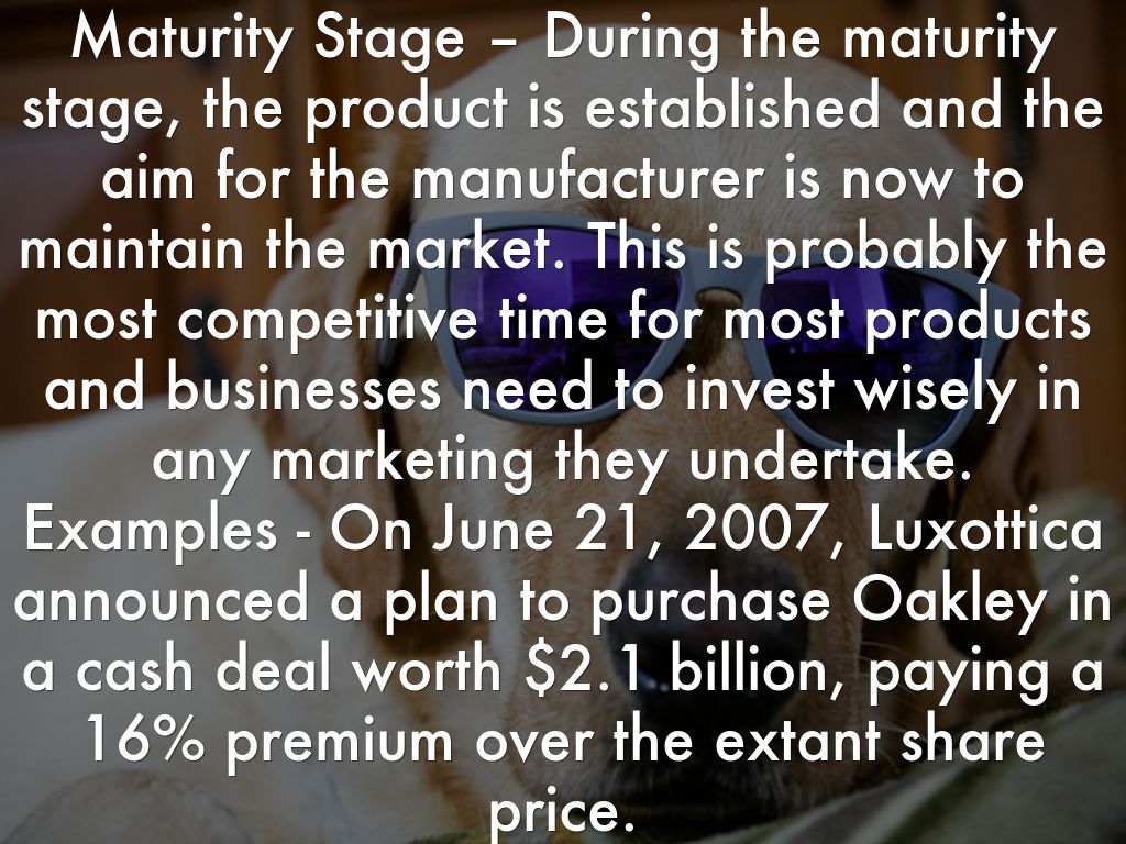 Maturity Stage – During the maturity stage, the product is established and the aim for the manufacturer is now to maintain the market. This is probably the most competitive time for most products and businesses need to invest wisely in any marketing they undertake. Examples - On June 21, 2007, Luxottica announced a plan to purchase Oakley in a cash deal worth $2.1 billion, paying a 16% premium over the extant share price.