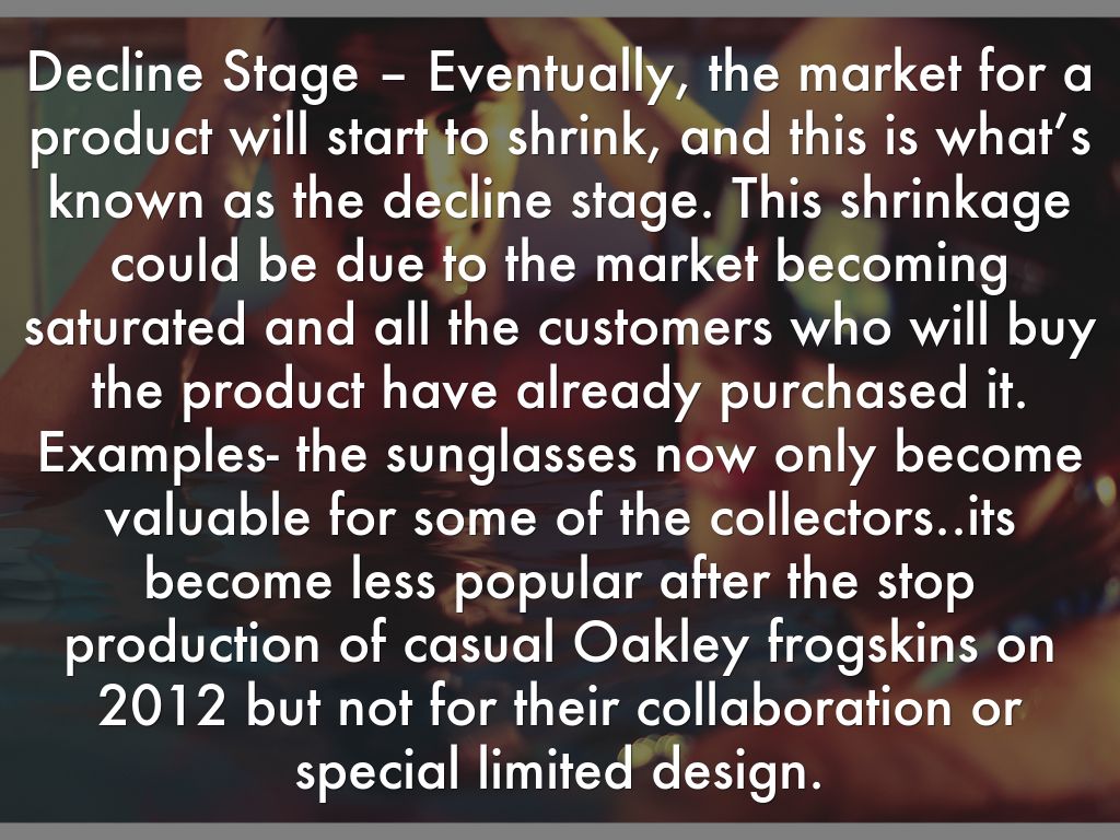 Decline Stage – Eventually, the market for a product will start to shrink, and this is what’s known as the decline stage. This shrinkage could be due to the market becoming saturated and all the customers who will buy the product have already purchased it. Examples- the sunglasses now only become valuable for some of the collectors..its become less popular after the stop production of casual Oakley frogskins on 2012 but not for their collaboration or special limited design.
