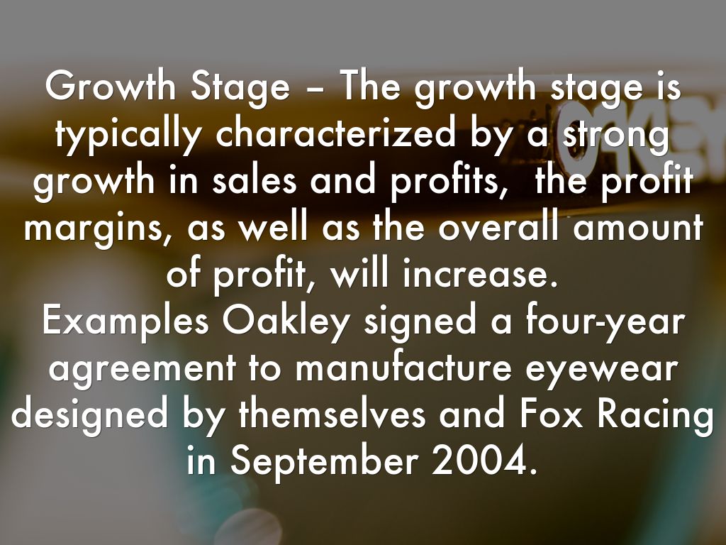 Growth Stage – The growth stage is typically characterized by a strong growth in sales and profits, the profit margins, as well as the overall amount of profit, will increase. Examples Oakley signed a four-year agreement to manufacture eyewear designed by themselves and Fox Racing in September 2004.