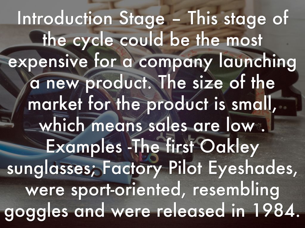 Introduction Stage – This stage of the cycle could be the most expensive for a company launching a new product. The size of the market for the product is small, which means sales are low . Examples -The first Oakley sunglasses; Factory Pilot Eyeshades, were sport-oriented, resembling goggles and were released in 1984.