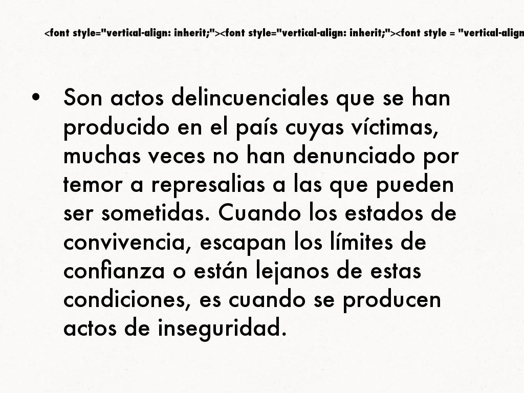 • Son actos delincuenciales que se han producido en el país cuyas víctimas, muchas veces no han denunciado por temor a represalias a las que pueden ser sometidas. Cuando los estados de convivencia, escapan los límites de confianza o están lejanos de estas condiciones, es cuando se producen actos de inseguridad.