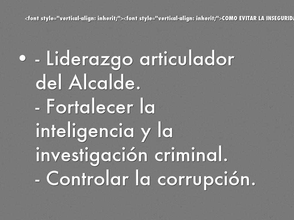 • - Liderazgo articulador del Alcalde. - Fortalecer la inteligencia y la investigación criminal. - Controlar la corrupción.