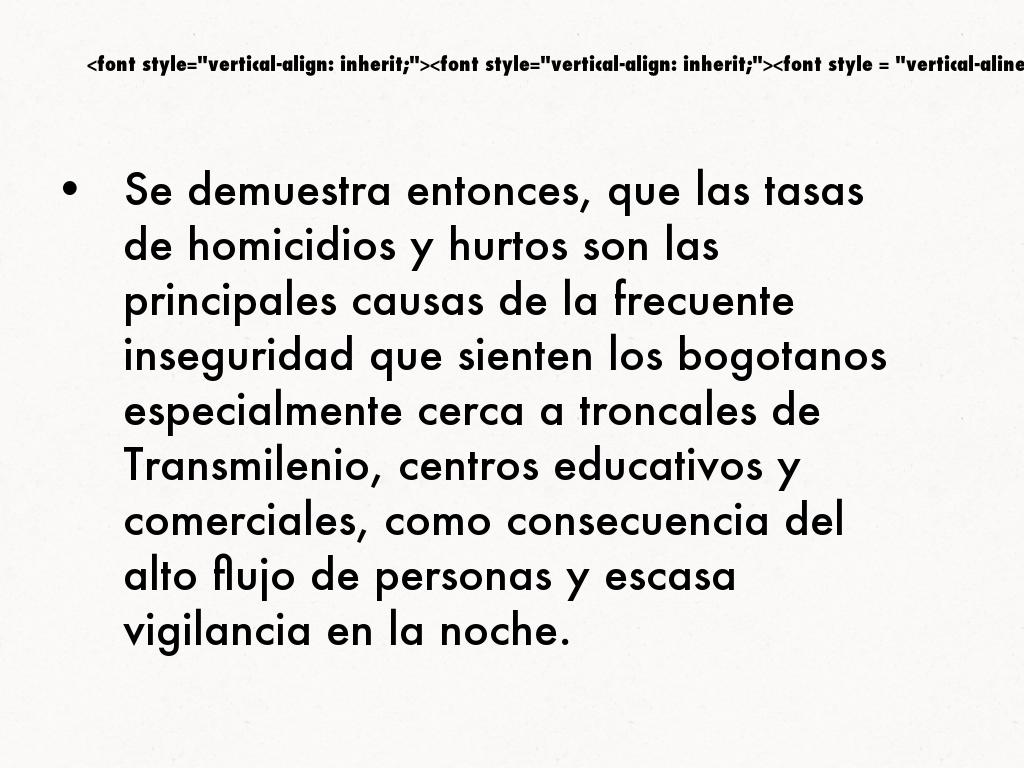 • Se demuestra entonces, que las tasas de homicidios y hurtos son las principales causas de la frecuente inseguridad que sienten los bogotanos especialmente cerca a troncales de Transmilenio, centros educativos y comerciales, como consecuencia del alto flujo de personas y escasa vigilancia en la noche.