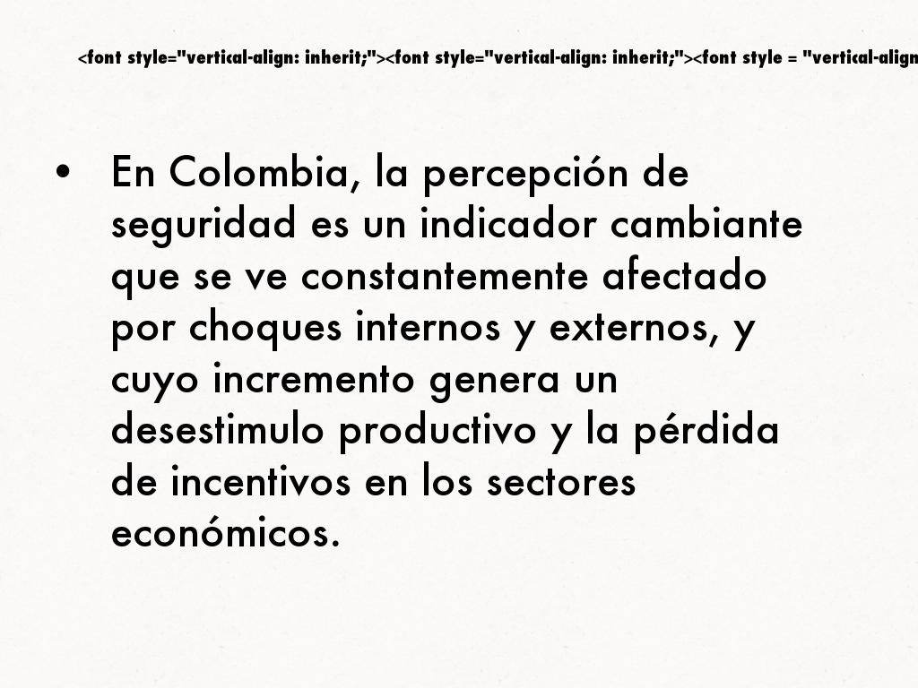 • En Colombia, la percepción de seguridad es un indicador cambiante que se ve constantemente afectado por choques internos y externos, y cuyo incremento genera un desestimulo productivo y la pérdida de incentivos en los sectores económicos.