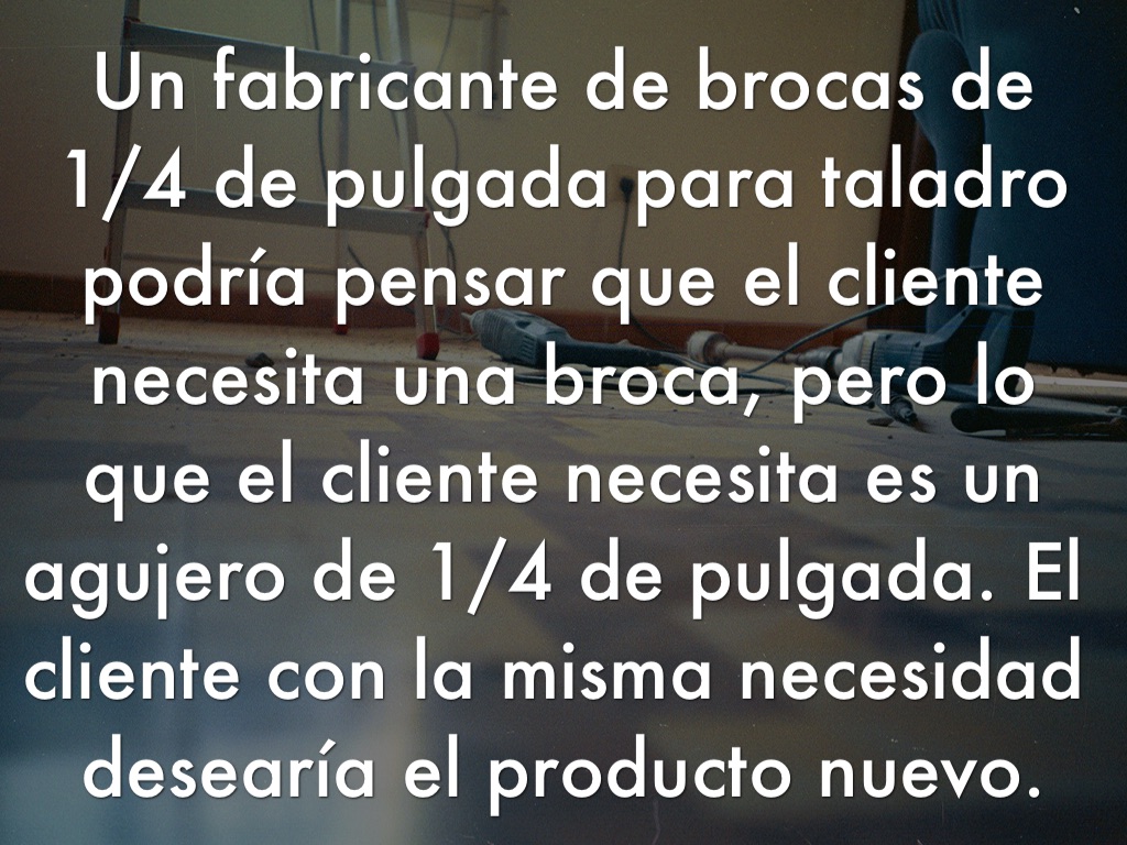 Un fabricante de brocas de 1/4 de pulgada para taladro podría pensar que el cliente necesita una broca, pero lo que el cliente necesita es un agujero de 1/4 de pulgada. El cliente con la misma necesidad desearía el producto nuevo.