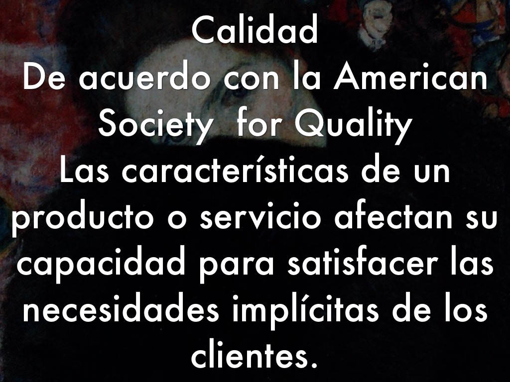 Calidad De acuerdo con la American Society for Quality Las características de un producto o servicio afectan su capacidad para satisfacer las necesidades implícitas de los clientes.