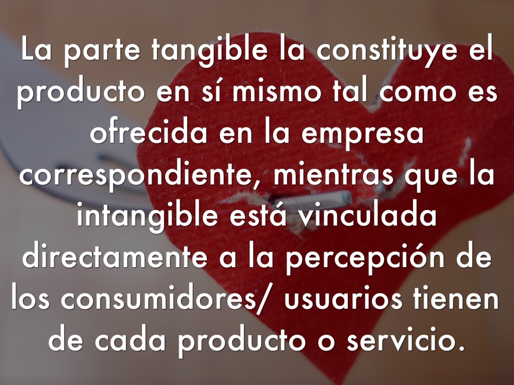 La parte tangible la constituye el producto en sí mismo tal como es ofrecida en la empresa correspondiente, mientras que la intangible está vinculada directamente a la percepción de los consumidores/ usuarios tienen de cada producto o servicio.