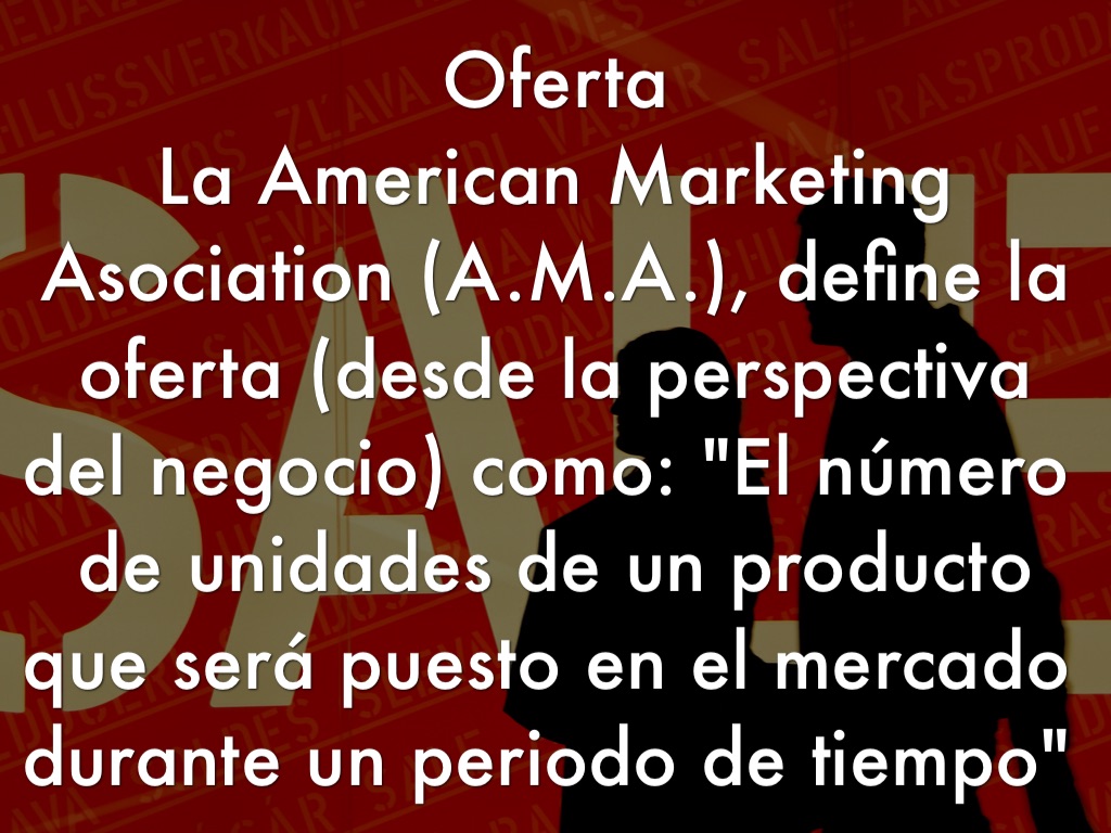 Oferta La American Marketing Asociation (A.M.A.), define la oferta (desde la perspectiva del negocio) como: "El número de unidades de un producto que será puesto en el mercado durante un periodo de tiempo"