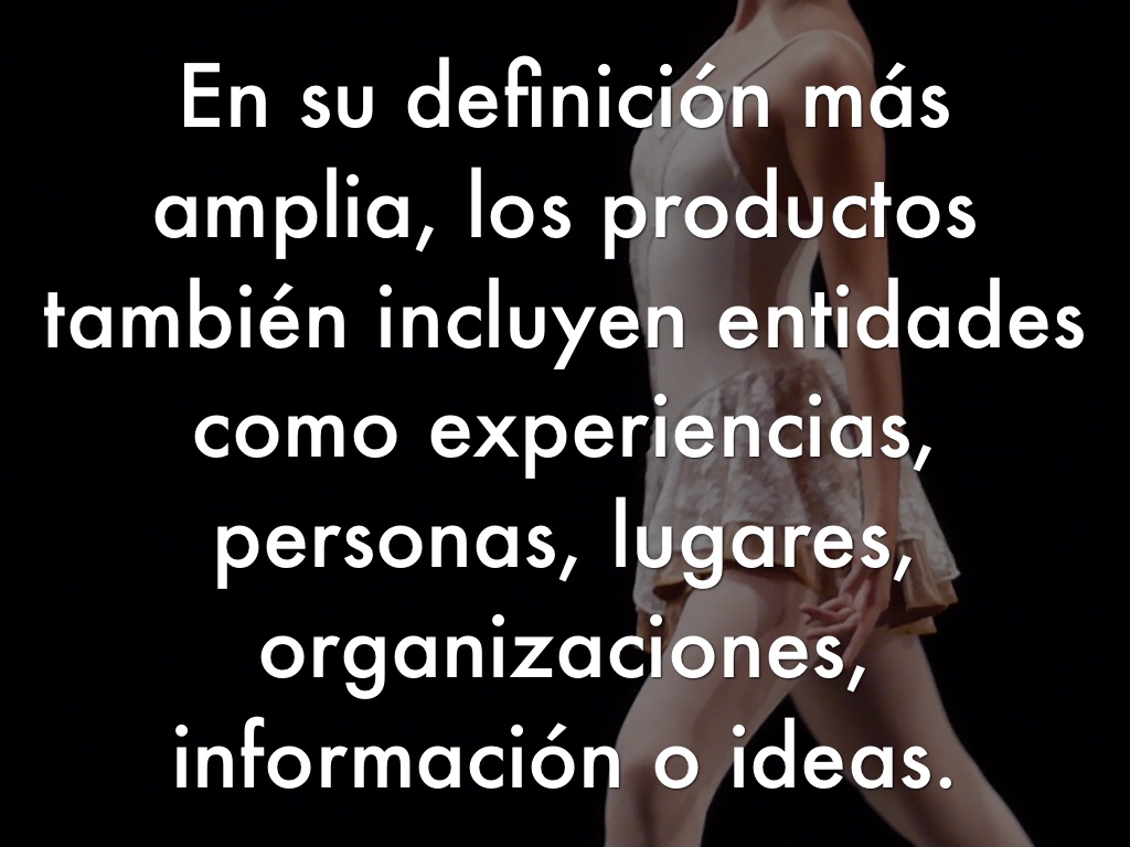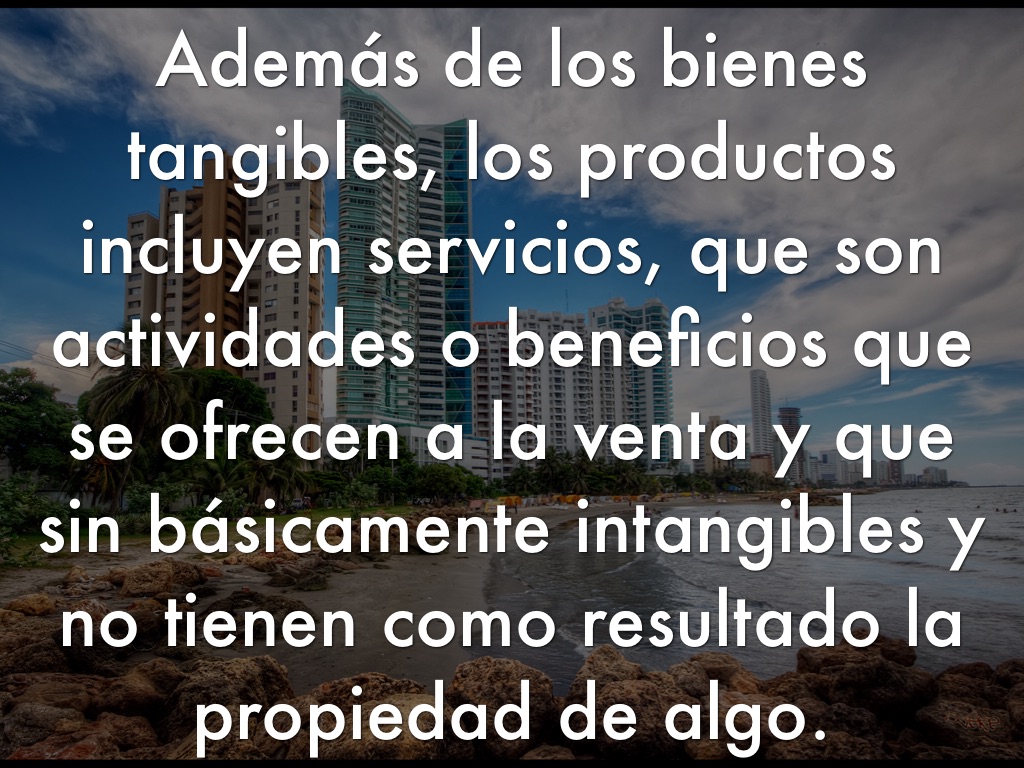Además de los bienes tangibles, los productos incluyen servicios, que son actividades o beneficios que se ofrecen a la venta y que sin básicamente intangibles y no tienen como resultado la propiedad de algo.