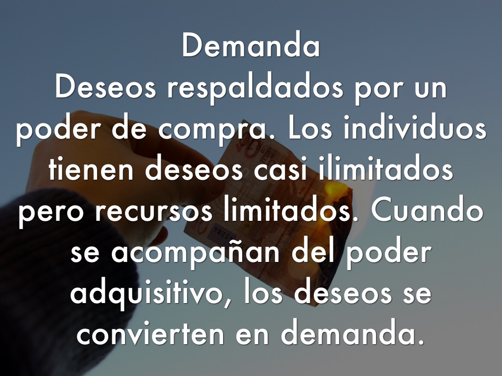 Demanda Deseos respaldados por un poder de compra. Los individuos tienen deseos casi ilimitados pero recursos limitados. Cuando se acompañan del poder adquisitivo, los deseos se convierten en demanda.
