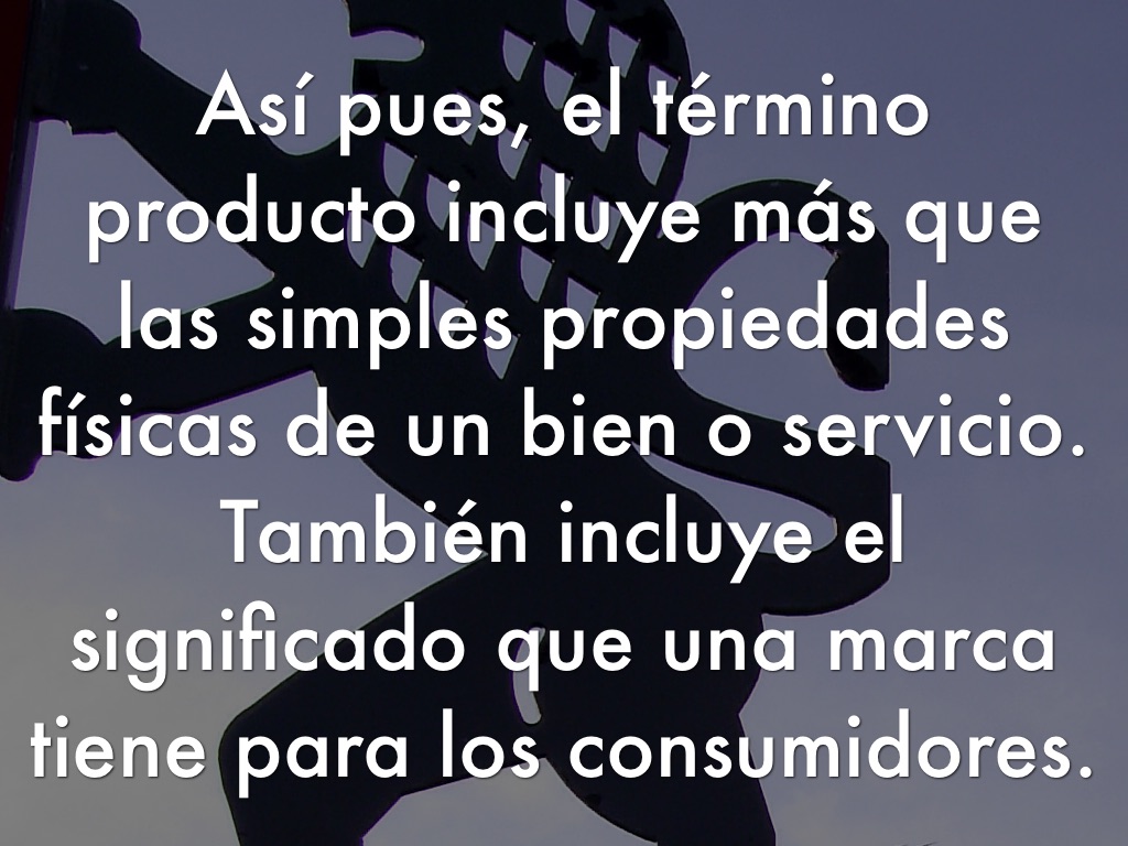Así pues, el término producto incluye más que las simples propiedades físicas de un bien o servicio. También incluye el significado que una marca tiene para los consumidores.