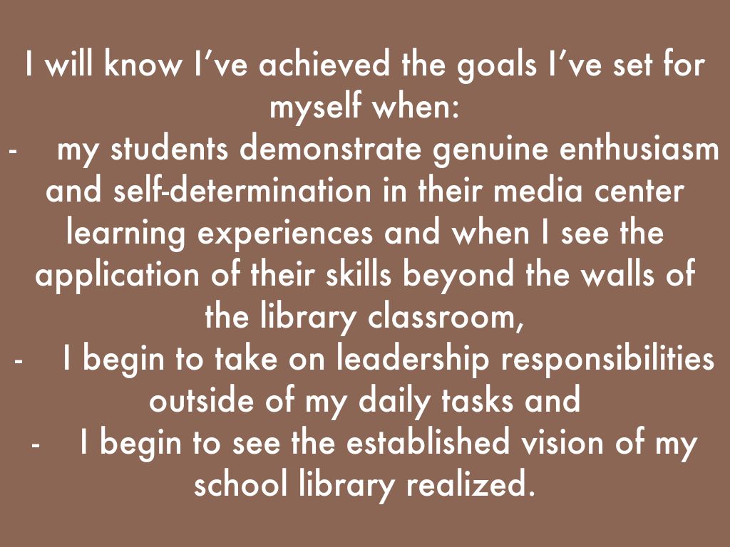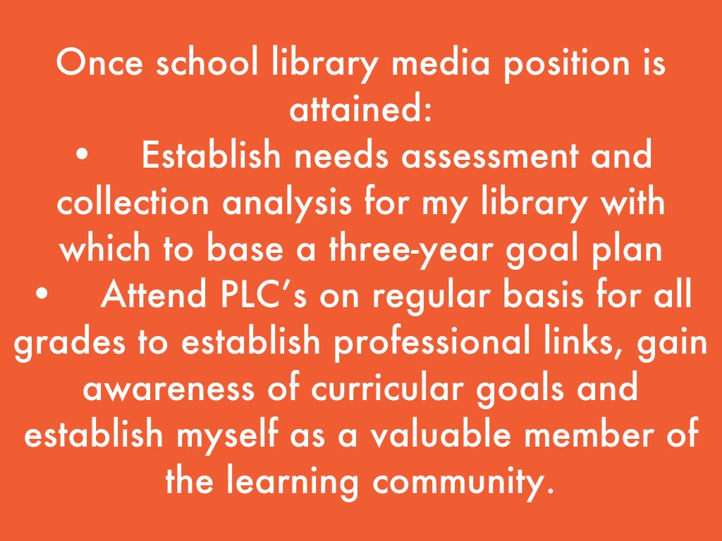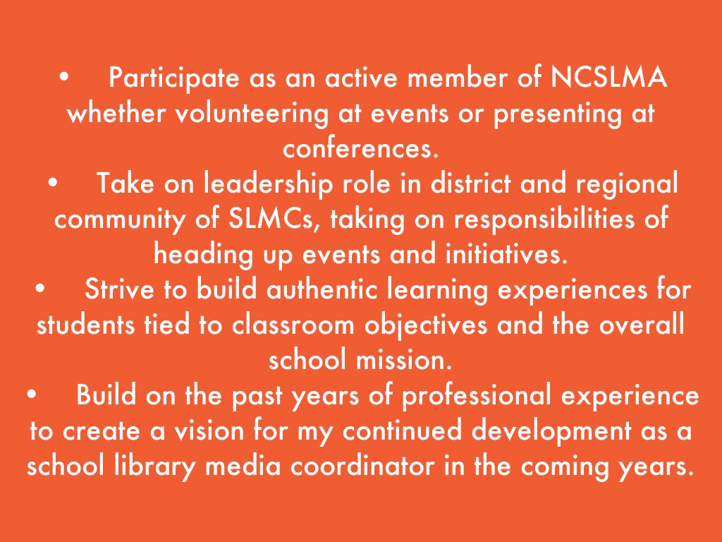 • Build on the past years of professional experience to create a vision for my continued development as a school library media coordinator in the coming years.