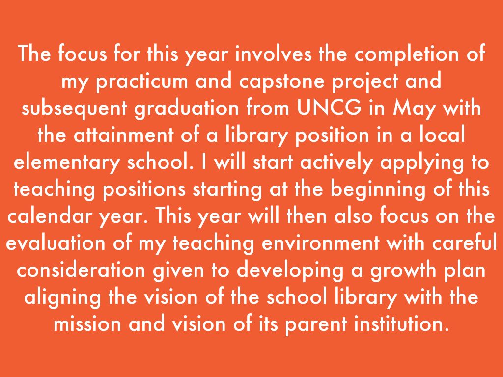 The focus for this year involves the completion of my practicum and capstone project and subsequent graduation from UNCG in May with the attainment of a library position in a local elementary school. I will start actively applying to teaching positions starting at the beginning of this calendar year. This year will then also focus on the evaluation of my teaching environment with careful consideration given to developing a growth plan aligning the vision of the school library with the mission and vision of its parent institution.
