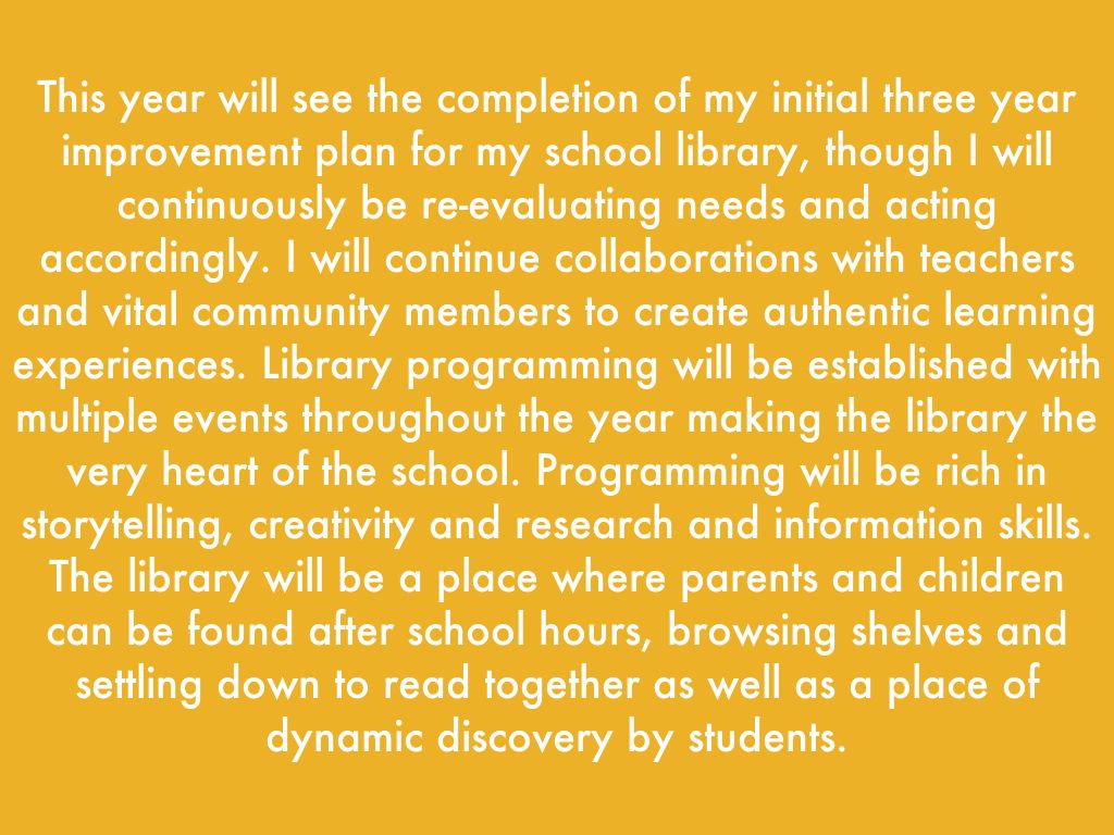 This year will see the completion of my initial three year improvement plan for my school library, though I will continuously be re-evaluating needs and acting accordingly. I will continue collaborations with teachers and vital community members to create authentic learning experiences. Library programming will be established with multiple events throughout the year making the library the very heart of the school. Programming will be rich in storytelling, creativity and research and information skills. The library will be a place where parents and children can be found after school hours, browsing shelves and settling down to read together as well as a place of dynamic discovery by students.