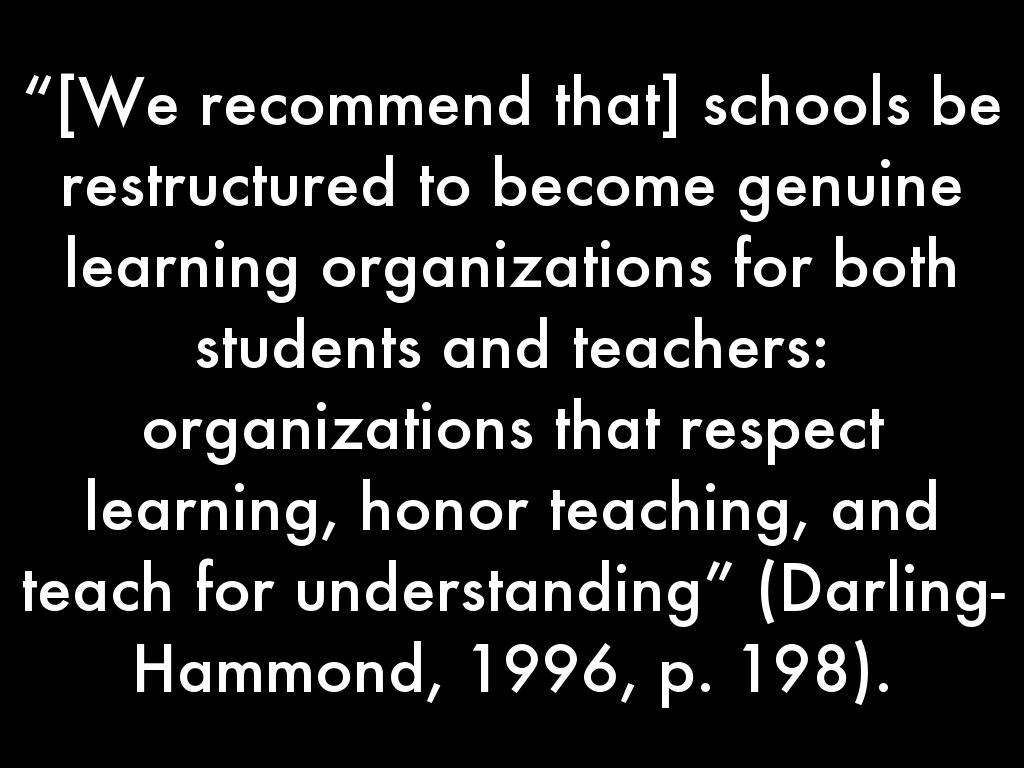 “[We recommend that] schools be restructured to become genuine learning organizations for both students and teachers: organizations that respect learning, honor teaching, and teach for understanding” (Darling-Hammond, 1996, p. 198).